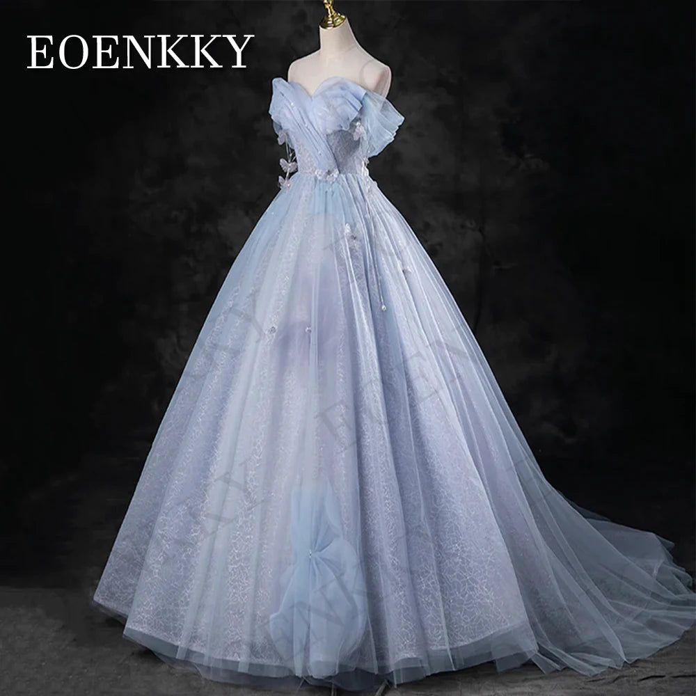 Blue Off Shoulder Princess Prom Dress Sparkly Beading Celebrity A Line Pearls Birthday 3D Flowers Evening Gown вечернее платье